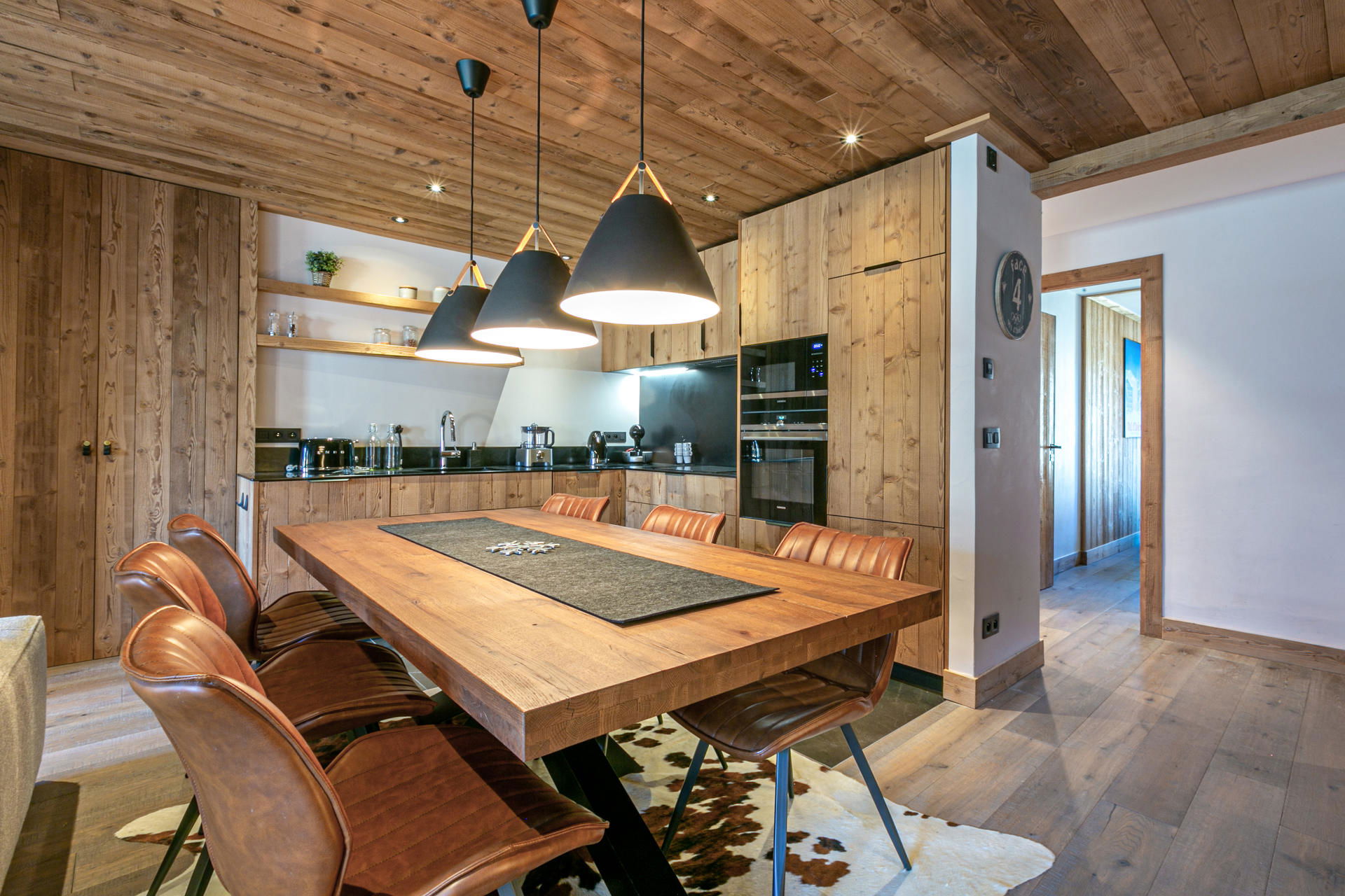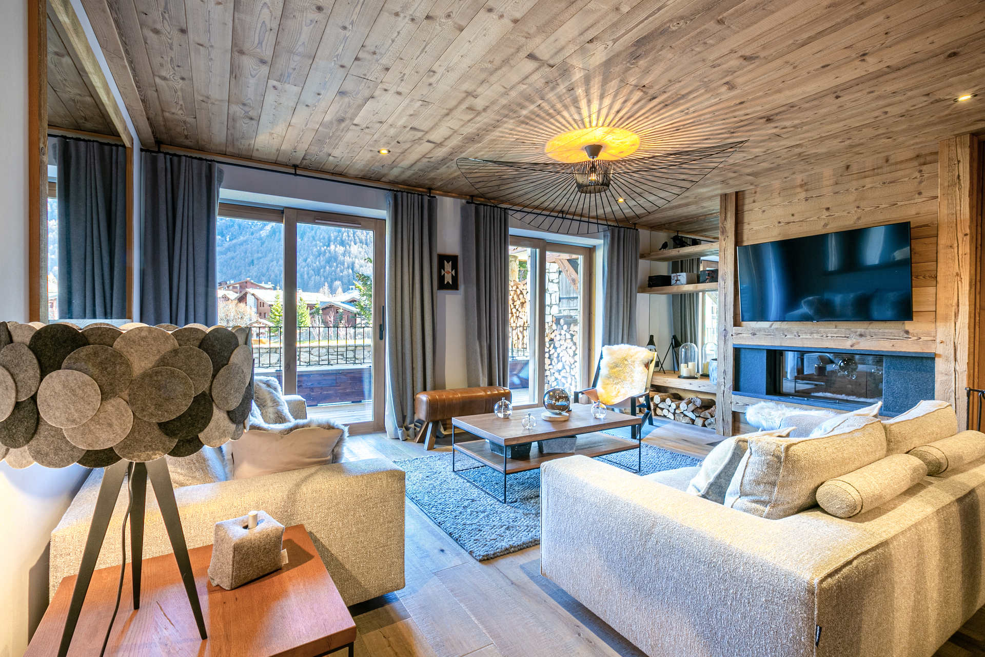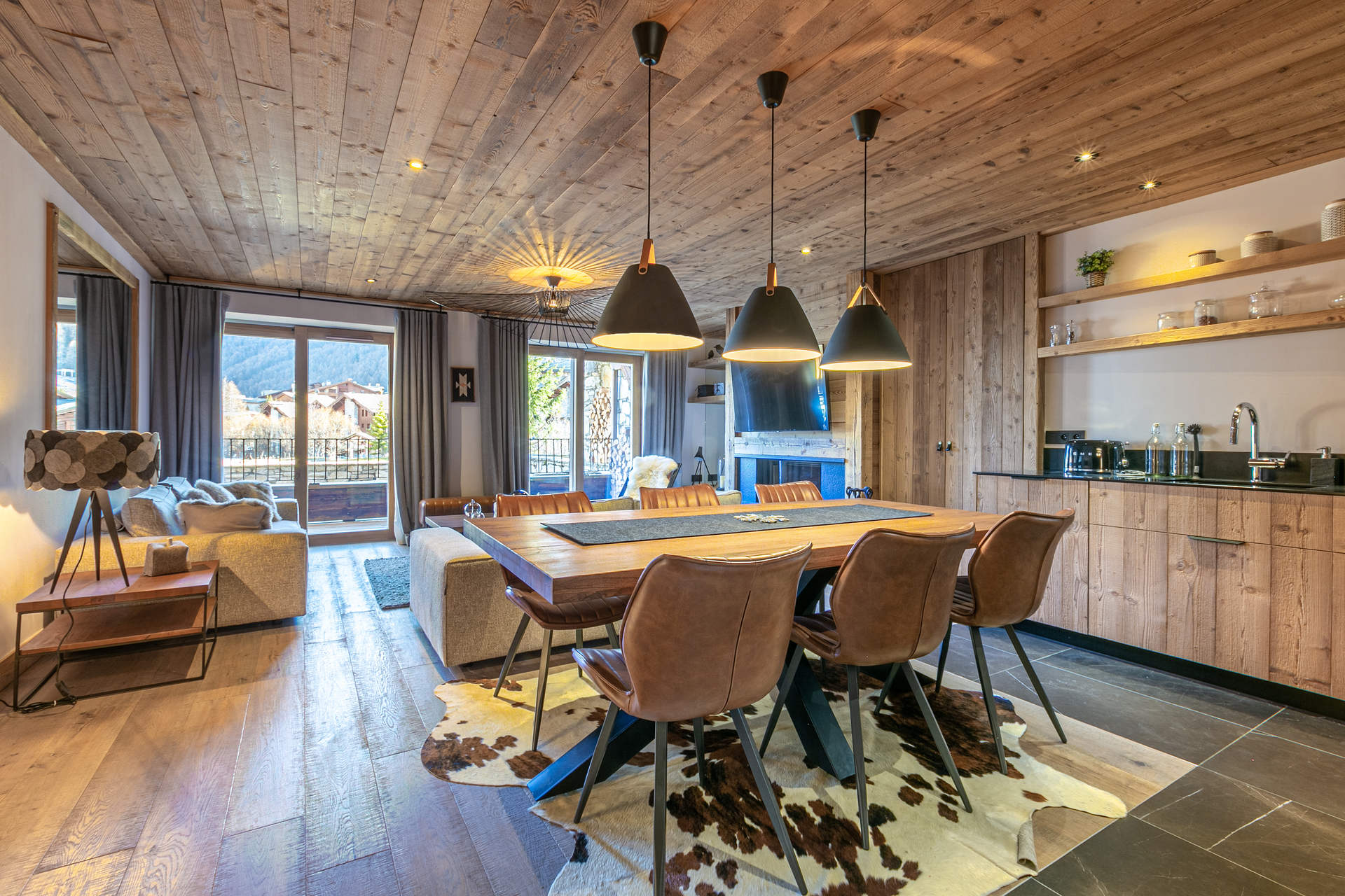 Interior of character combining contemporary decoration with an authentic mountain touch and warm architecture made of reclaimed wood and stone.