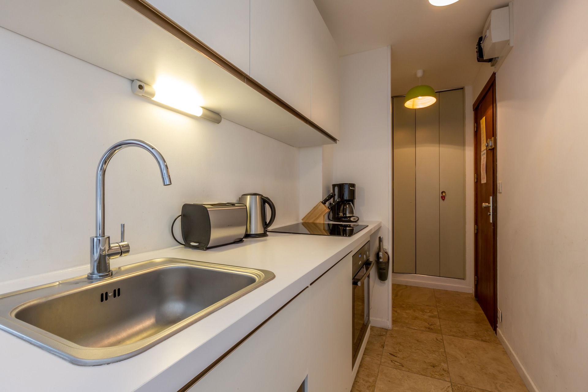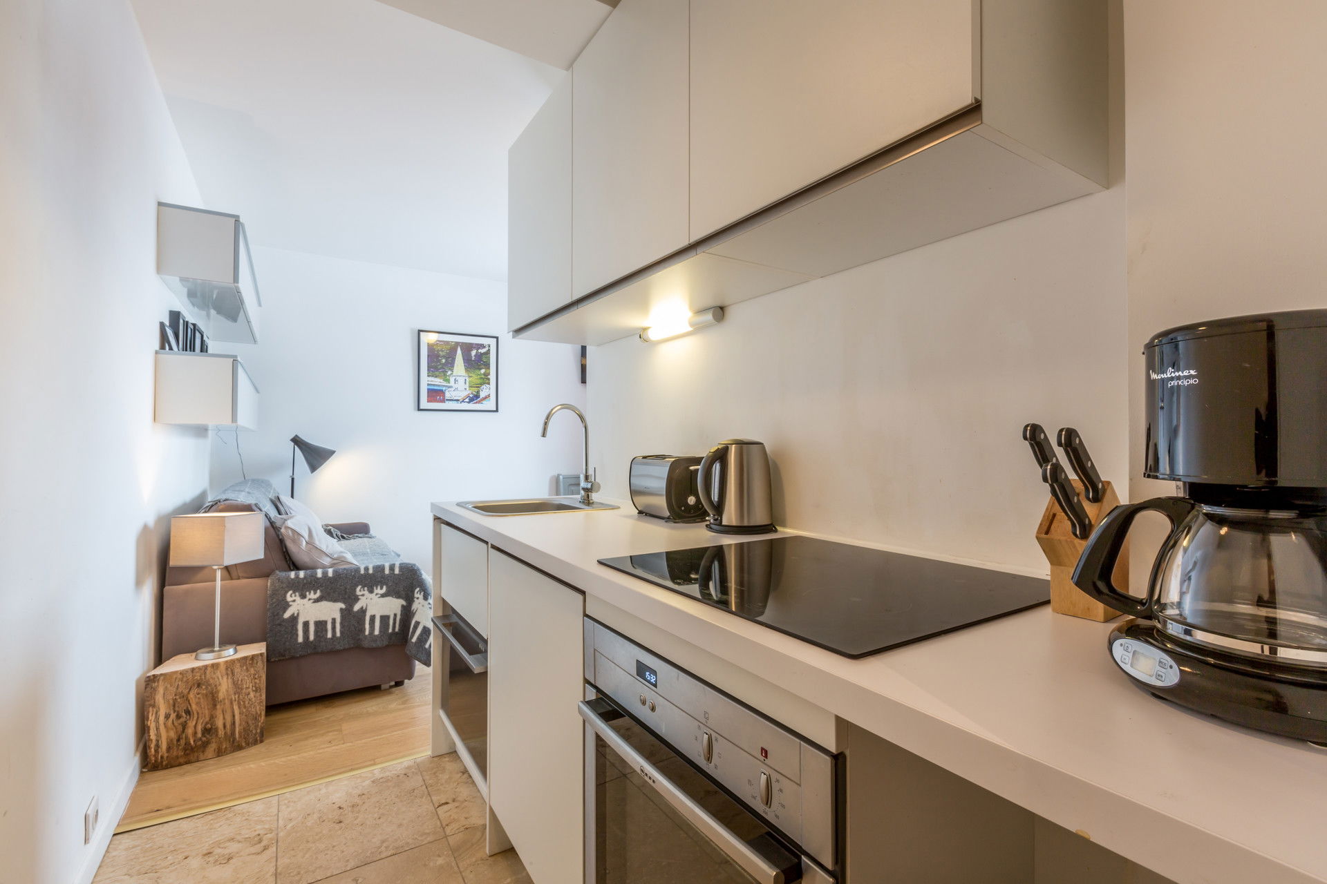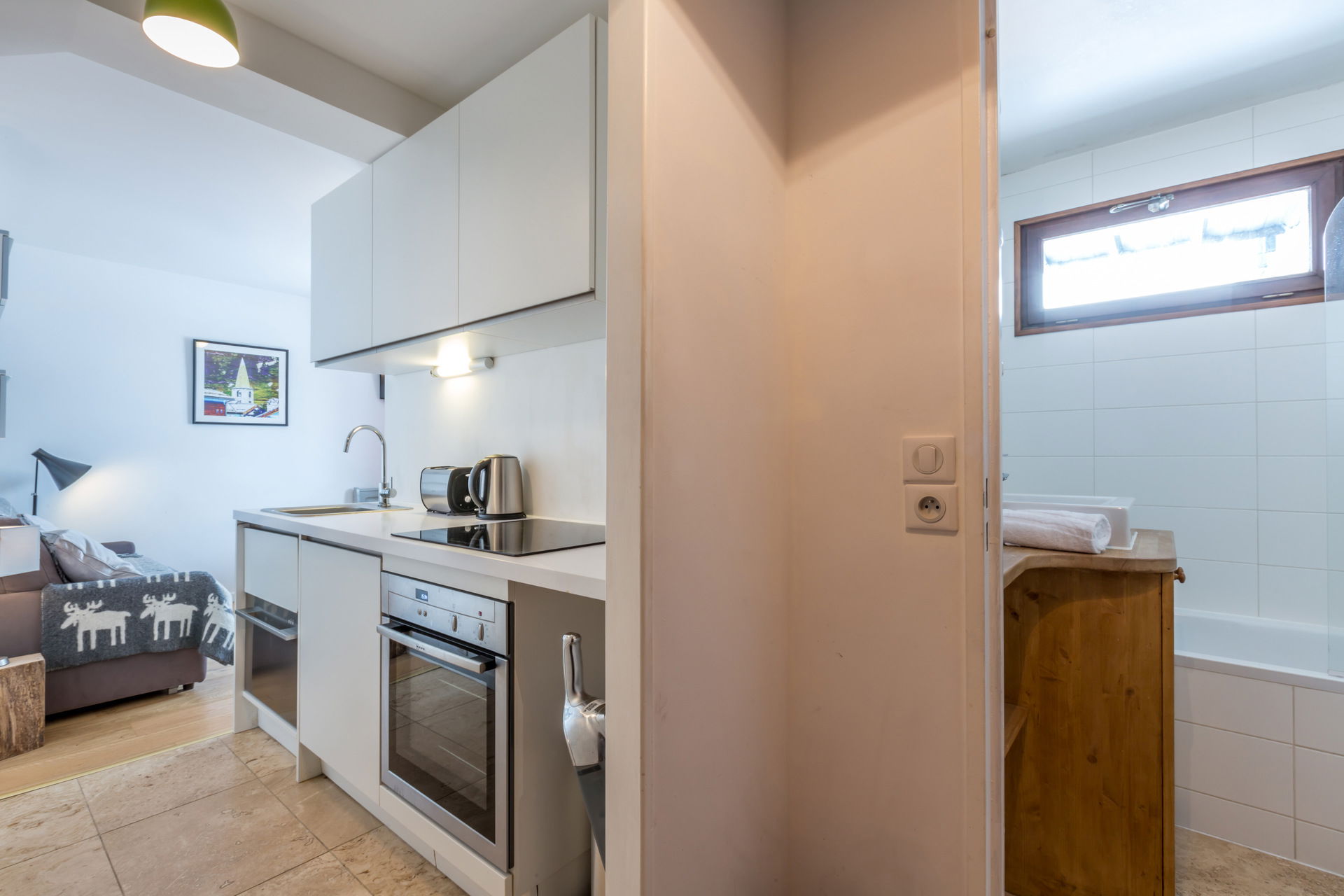 Equipped with oven, small dishwasher, induction hob, fridge