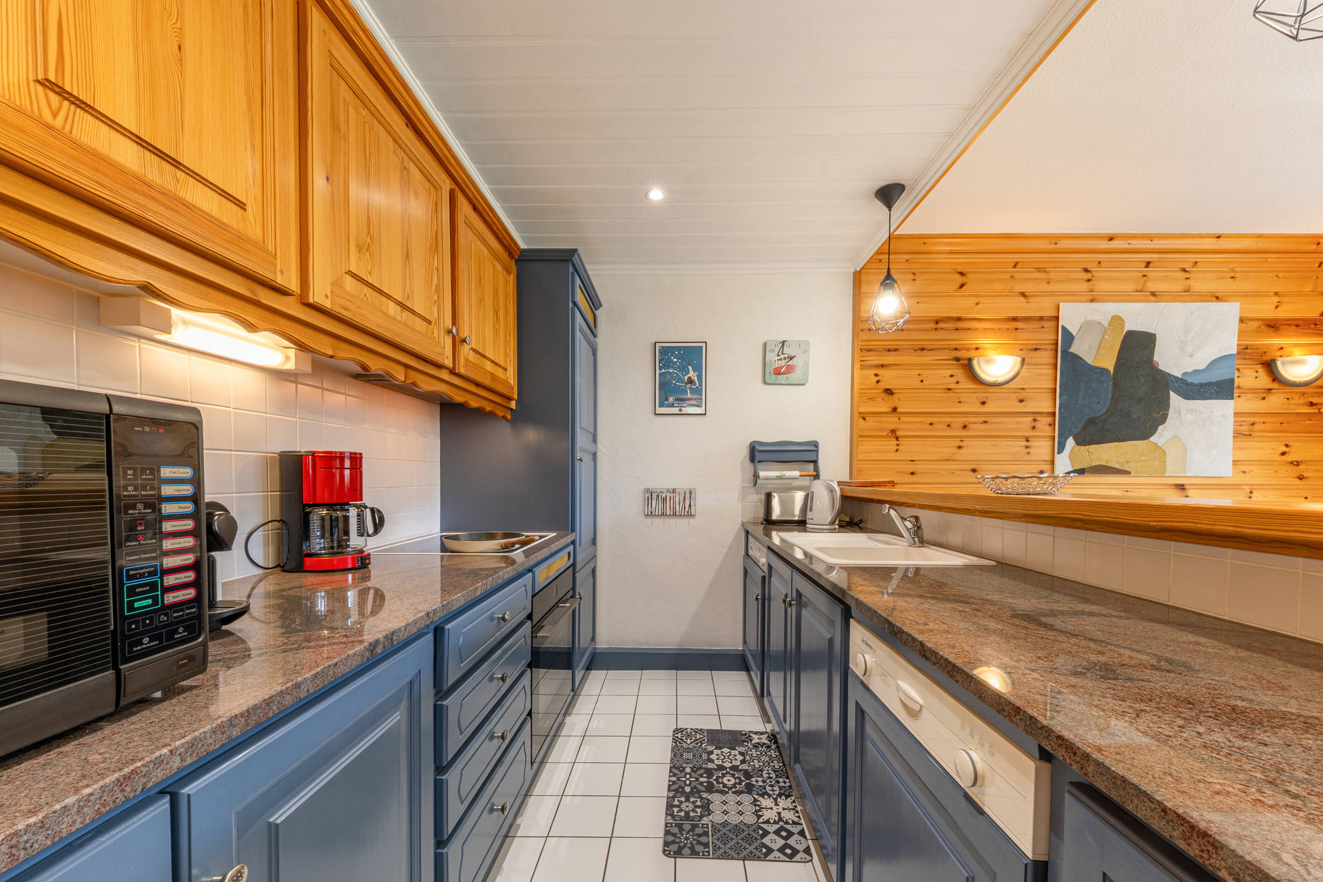Equipped with oven, hood, dishwasher, washing machine, ceramic hob, fridge with freezer and microwave oven