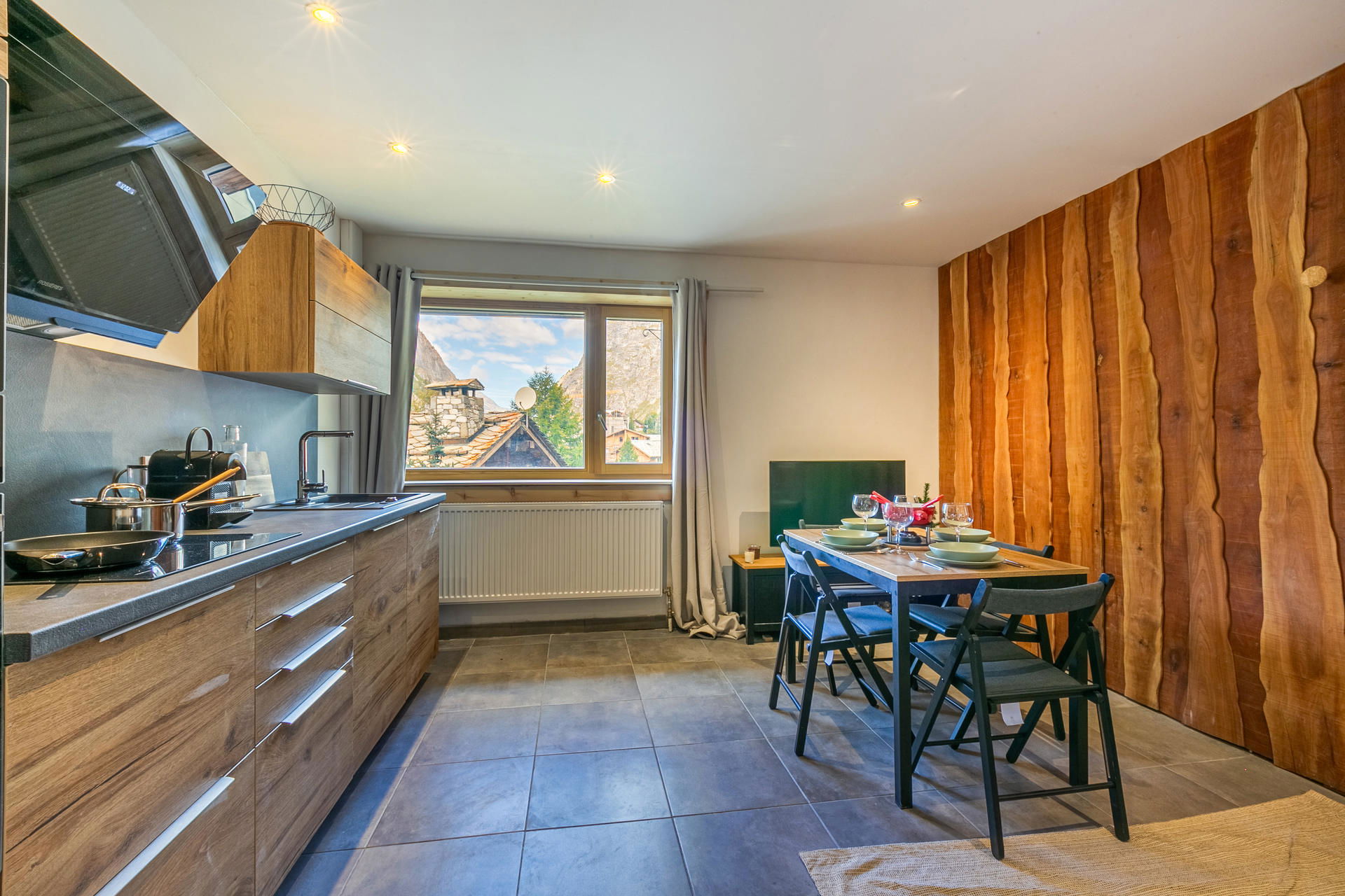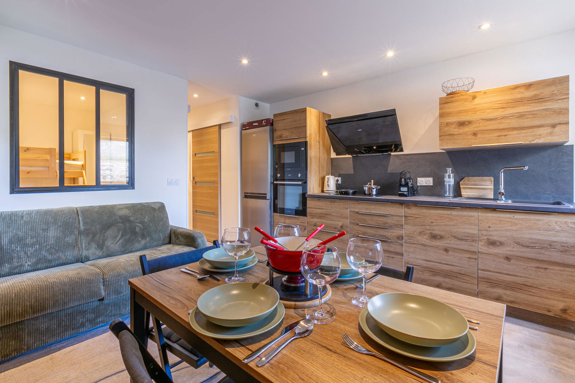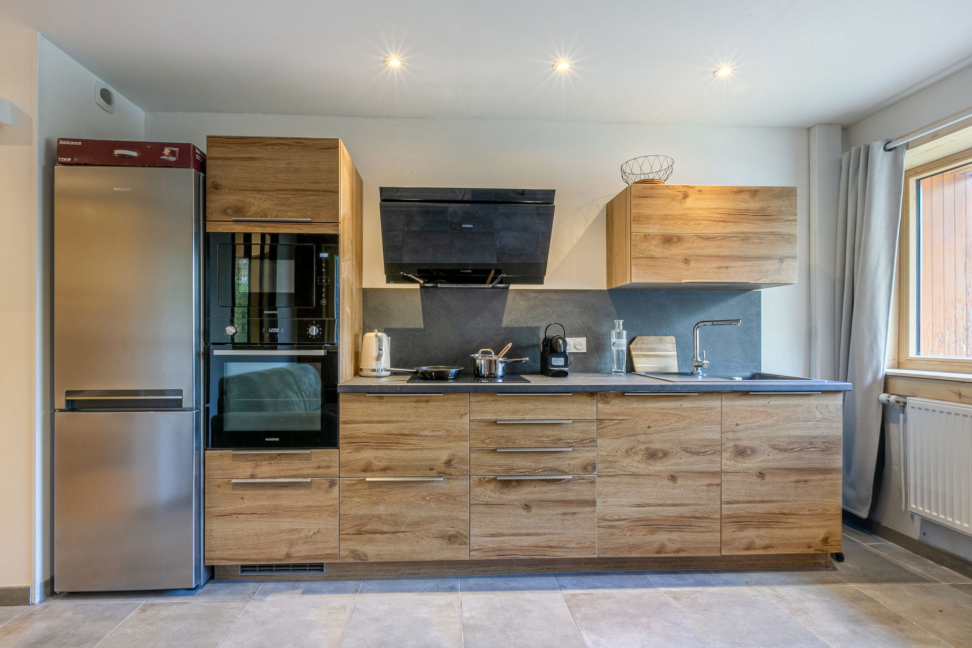 Equipped with oven, microwave oven, hood, large fridge, freezer, dishwasher, induction hob