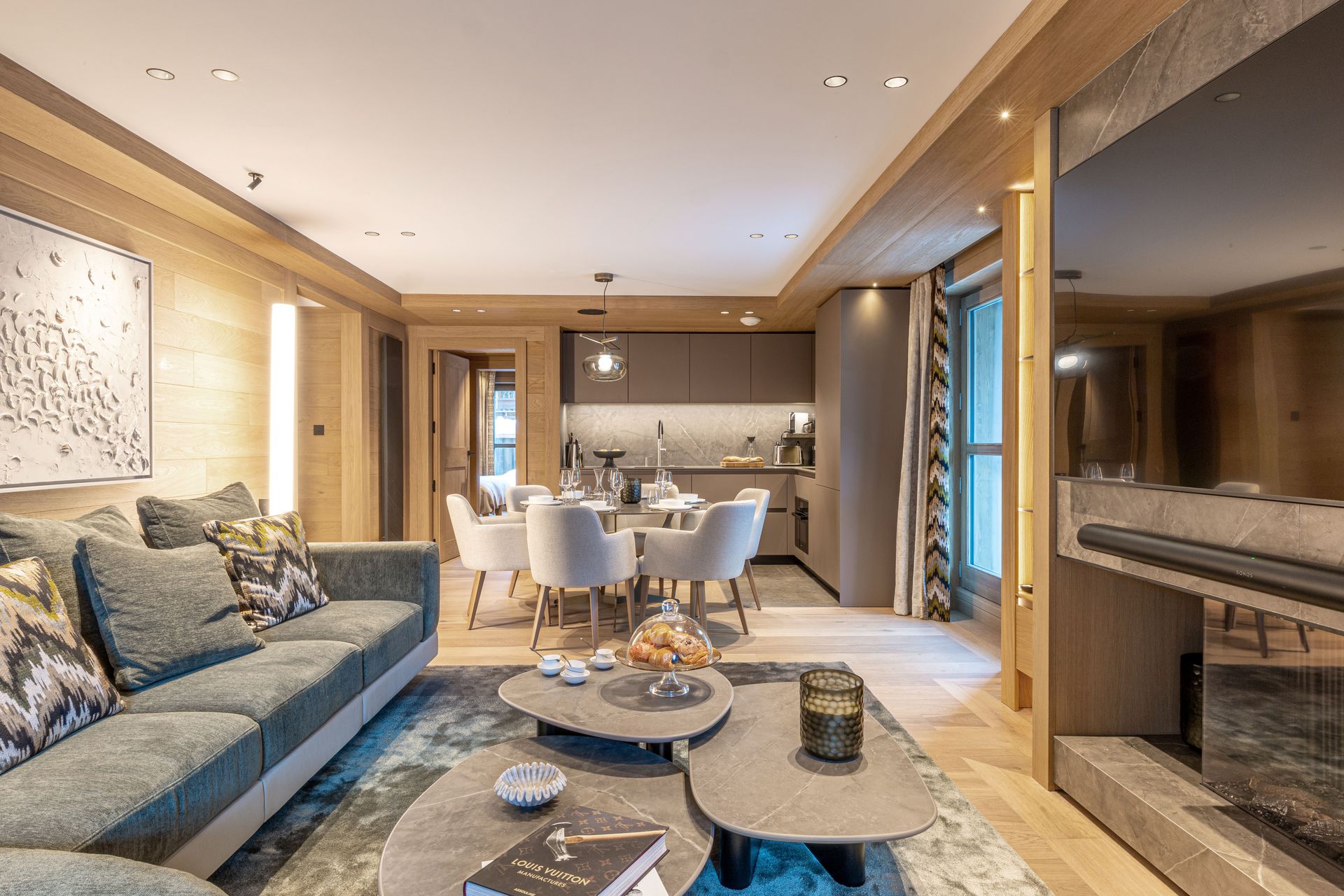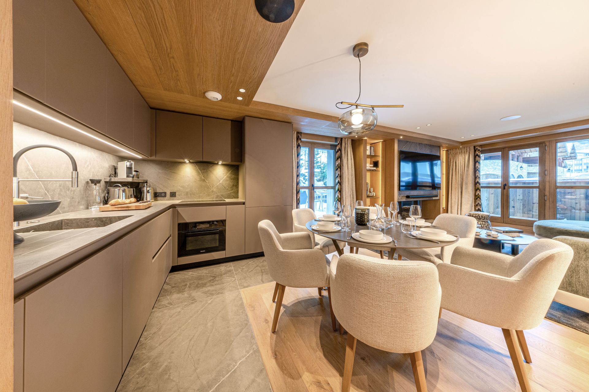 Equipped with dishwasher, oven, induction hob, extractor hood, microwave, large fridge with freezer