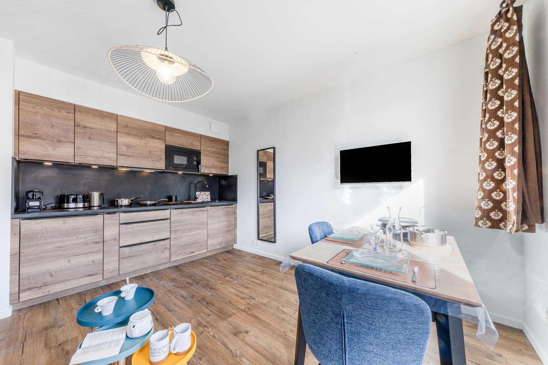 Equipped with ceramic hob, microwave, fridge, extractor hood