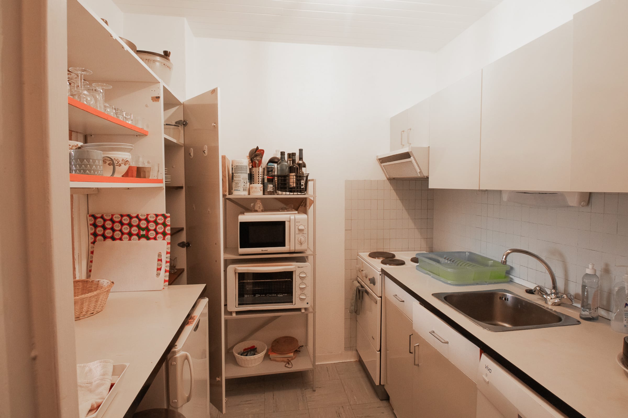 A kitchenette with the essentials (note: it is only partially equipped and there is just one cooking hob): fridge, dishwasher, microwave, toaster, coffee machine, and a raclette machine