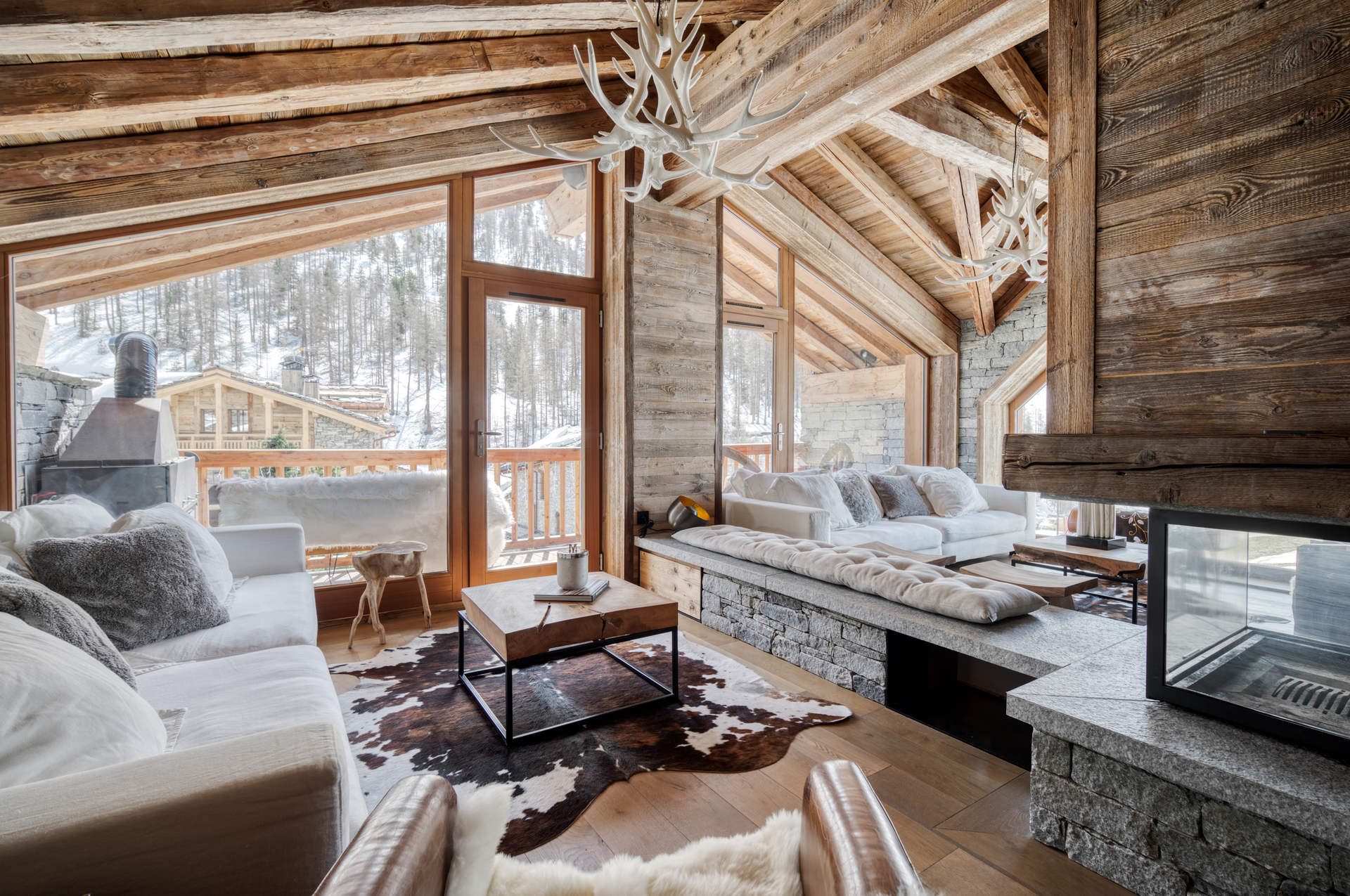 Large and comfortable living room with fire place (logs provided) caracterized by its volume with heigh under roof and large windows